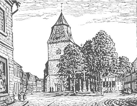 Der bekannte Holzschnitt von Heinz Evers zeigt den vorigen Kirchturm. Im Jahre 1472 erhielten "mester Lambert Schwegell und Matthäi, syne sone" den Auftrag, den Turm der (damaligen romanischen) Kirche zu ummauern (zu verdicken) und höher zu bauen. In einer im Pfarrarchiv vorliegenden Urkunde heißt es darüber. "Des sullen de twe vorg. mestern...... den kerktorn moren 40 voet högher, denn he en is. Wenn se dat erstlick semsell (Gesims) leggen, 9 voet dick, und wenn se dat leste leggen, da soll dy muer blieven 4 voet dick. Unde se sollen houven (mauern).... einen boghen in der kerken und to der kerkdor, als sick dat gebort (gebührt). Oik sollen de vorgenannten mesters dem kerktorne twe pilers leggen, buten an der erde, als dat bedinget is; oik sollen sy enen windelsteen (Wendeltreppe) leggen bowen up dat welfte (Gewölbe), de erste Door van den windelsteen soll hoghe syn 5 voethe van der erden usw."
